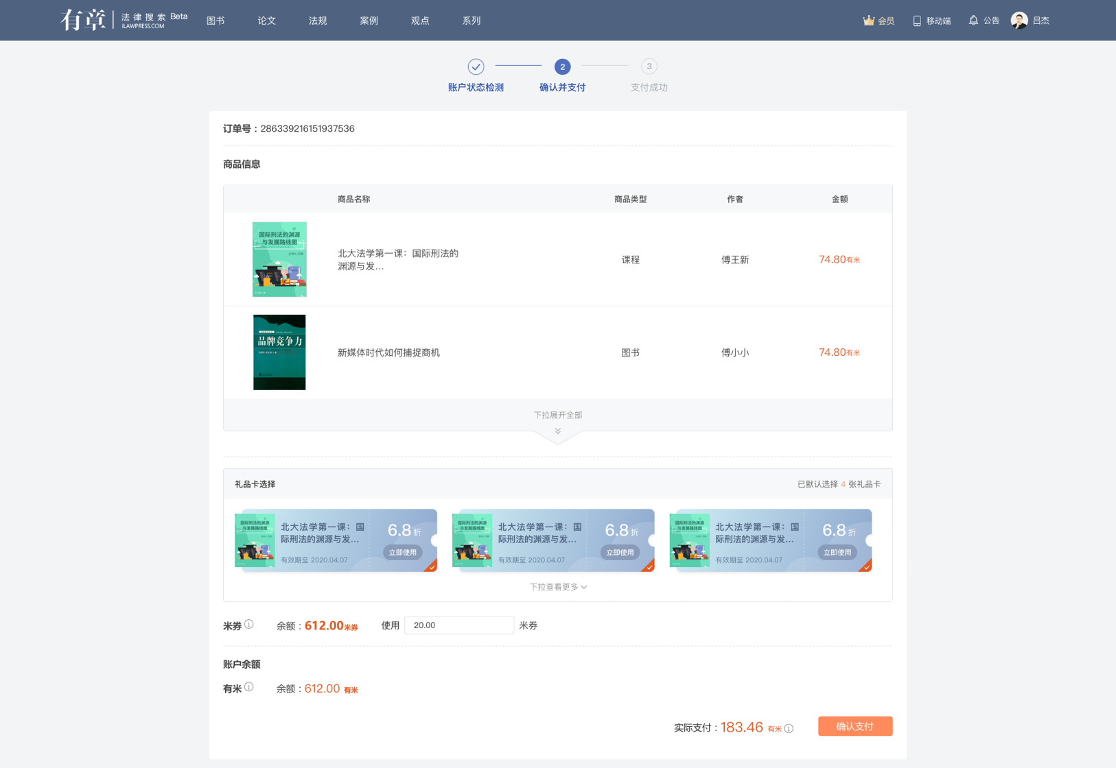 f. 如為系列或出版物訂單,且您享有多張可用禮品卡,系統(tǒng)將針對多個資源默認(rèn)為您使用(如下圖);